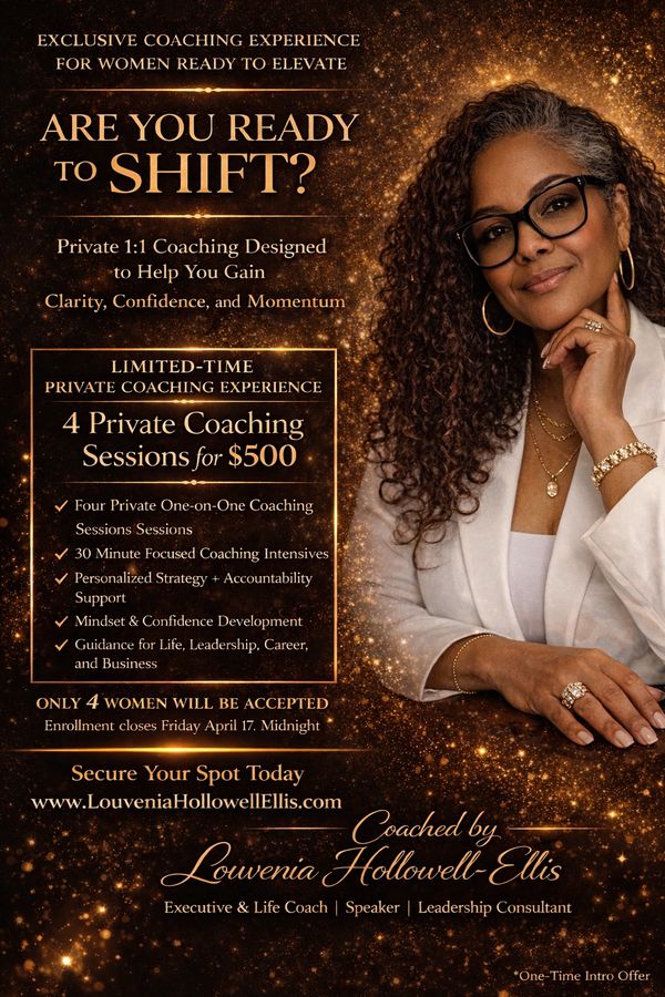 Through four focused one-on-one coaching sessions, Louvenia Hollowell-Ellis provides personalized guidance, mindset coaching, accountability, and strategic support tailored to your unique goals and vision.
